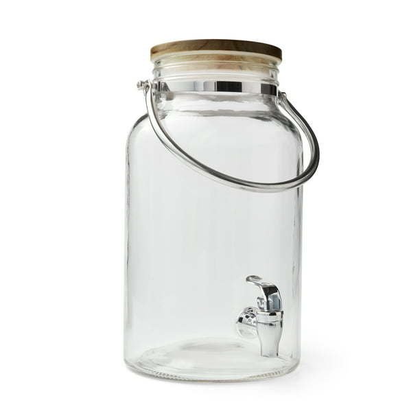 The Better Homes & Gardens 1.5 Gallon Glass Beverage Dispenser with Wood Lid. Designed with clear glass to allow contents and amounts to be readily identified, this lovely beverage dispenser features a sturdy steel handle that makes transporting and cleaning easy. Topped with a solid wood lid with a gray finish that is both decorative and functional, the dispenser has a reliable plastic spigot that keeps liquids contained until it's time to pour. Perfect for parties, family meals, or just resting on your counter to keep a ready supply of water, iced tea, lemonade, or another of your favorite beverages available, the Better Homes & Gardens 1.5 Gallon Glass Beverage Dispenser with Wood Lid is a hand-wash only.