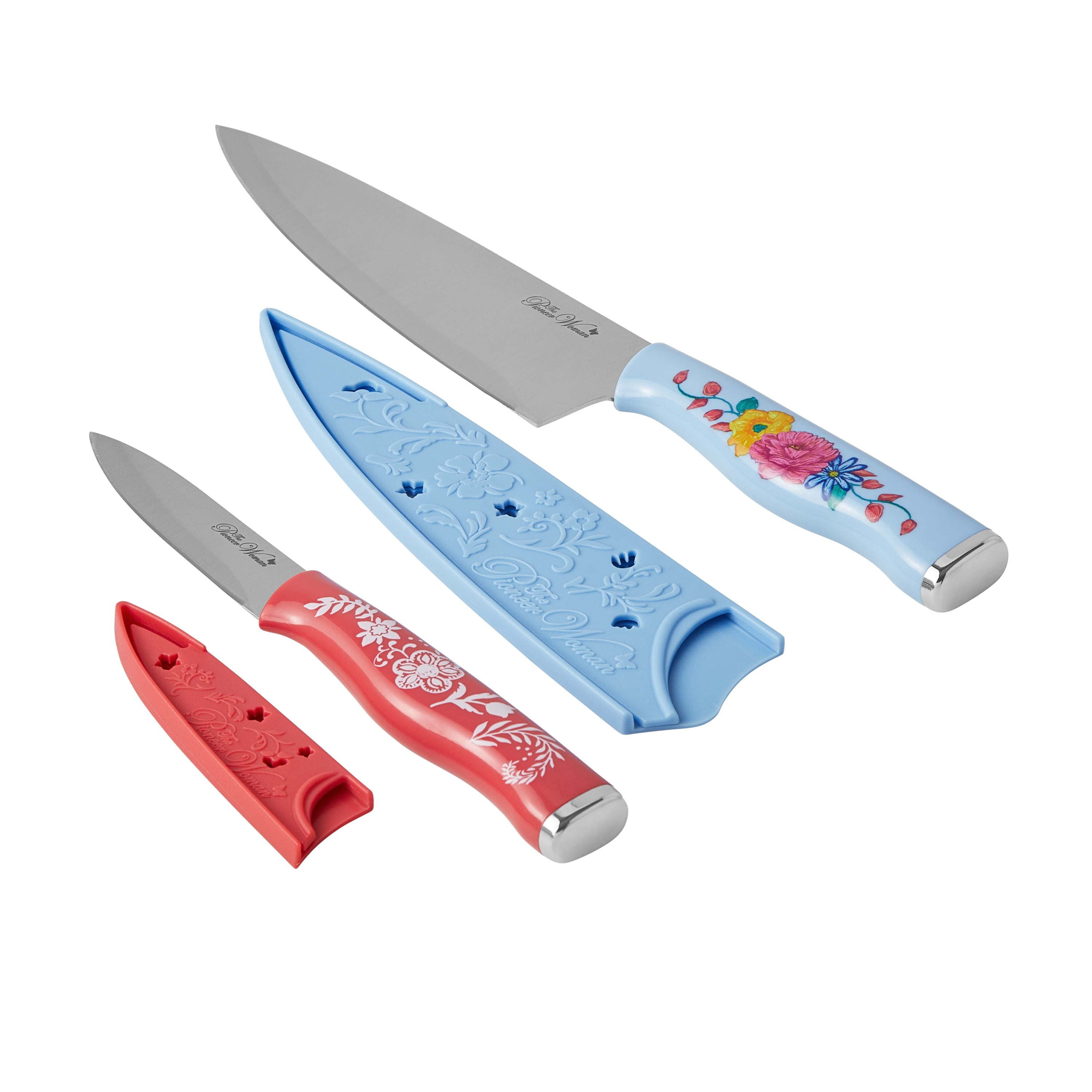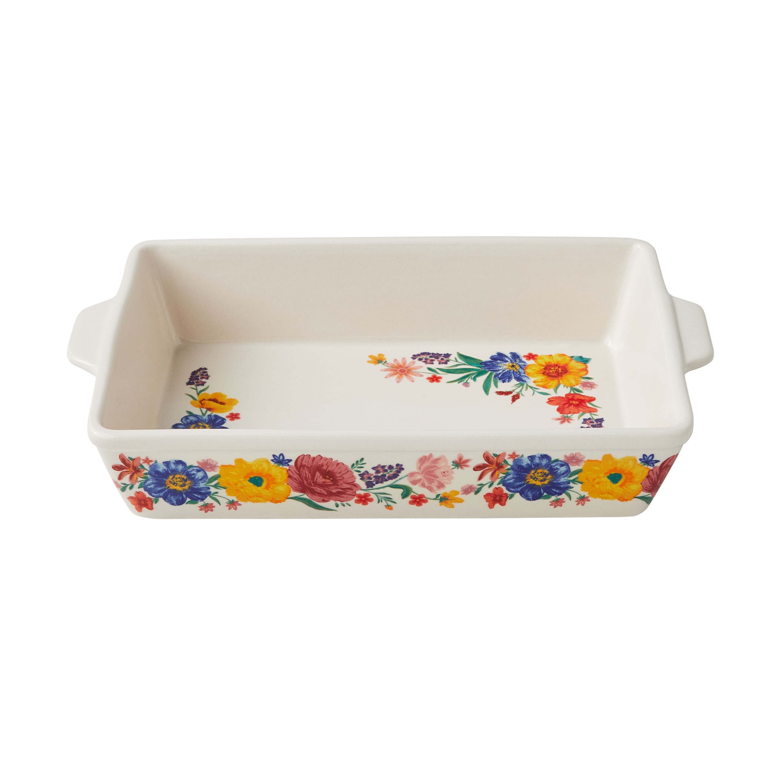 Brilliant Blooms 38-Piece Cookware Set, Teal Includes 2.5 qt saucepan with lid, 5.5 qt casserole dish with lid, 8" skillet, 10" skillet, 3.5 qt saute pan with lid, rectangular ceramic baking pan, and a 9" cast iron skillet 12" acacia spoon, 12" acacia turner, 8" chef knife w with sheath, 3.5" paring knife with sheath, 4 melamine measuring cups, and 4 melamine measuring spoons 4 felt protectors, 13" x 9" acacia cutting board, acacia wood spoon rest, 2 PP cutting mats, 32 ounce melamine batter bowl with PP lid, and 2 round ceramic bowls with PP lid Features Ree's signature floral design for a vibrant addition to your kitchen Everything you need to make delicious meals for friends and family Features Ree's signature floral design for a vibrant addition to your kitchen
