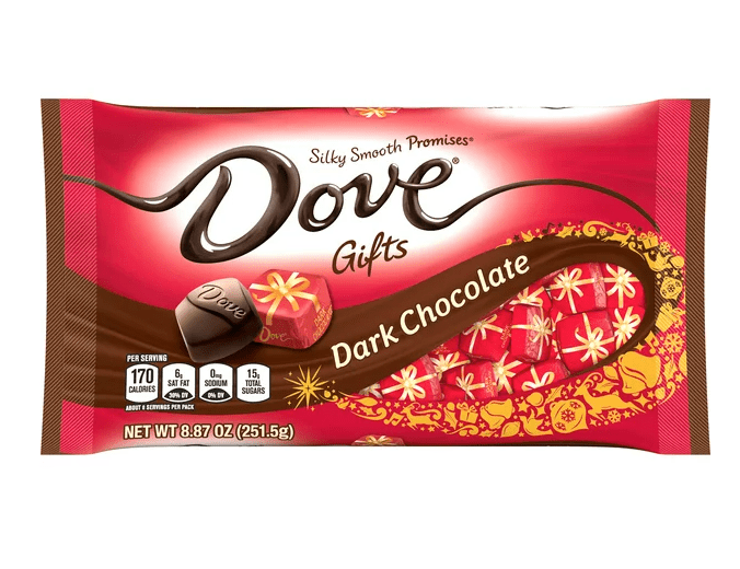 Celebrate the holidays with the luxurious taste of DOVE Dark Chocolate Gifts Holiday Candy. DOVE PROMISES Dark Chocolate Candies are individually wrapped; so they are perfect for sharing with friends or coworkers at holiday parties. And since they're made with only the finest ingredients; your friends and family can't wait to enjoy a dark chocolate holiday treat with you. Use these festively wrapped dark chocolates to fill your candy bowl at work or as stocking stuffers for the chocolate lovers in your life. Treat yourself to a dark chocolate indulgence this holiday season!