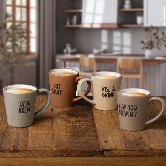 Home Essential 3 fl oz Stoneware assorted espresso mug set. Crafted out of Stoneware, Each cup features a simple design that is complemented by on-trend, matte finish color. These cups are the perfect way to get your morning started, whether you like it short, double or macchiato! Available in four colors and saying including ' Hot stuff', 'Deja Brew', ' Rise & Grind', 'How You Brewin’ ?'. Great for parties, catering, pool side, and entertaining. The cups can be used for more than just espresso, use for gelato, soups and more.Holds 3 ozSold IndividuallyEach mug has a saying- Hot Stuff, Rise & Grind, How You Brewing, and Deja BrewColors: Multi