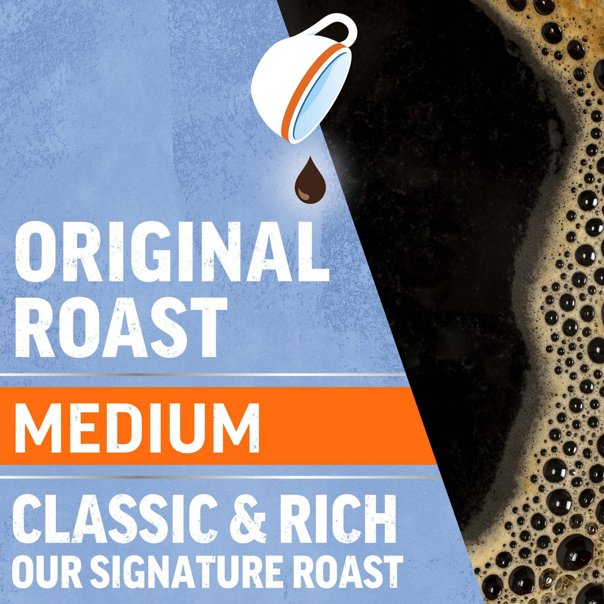 Maxwell House Original Roast Ground Coffee has a consistent signature taste that is good to the last drop. The brewed coffee made from this rich and classic original roast is exceptionally smooth and aromatic and is made for coffee lovers. It's just one of Maxwell House's many delicious ground coffee flavors. Made with 100% pure, fresh coffee beans, this medium roasted, naturally flavored coffee is great served black or with cream and sugar. Brew a pot of this Kosher coffee in any drip coffee maker. The 42.5-ounce resealable canister of ground coffee beans locks in flavor in between uses. From lively light roasts to full bodied dark blends, Maxwell House's signature taste is created through a process that isn't done the easy way, but the right way, for 125 years. Check out other flavored coffee grounds from Maxwell House, like half caff ground coffee, espresso roast, vanilla flavored coffee and much more.