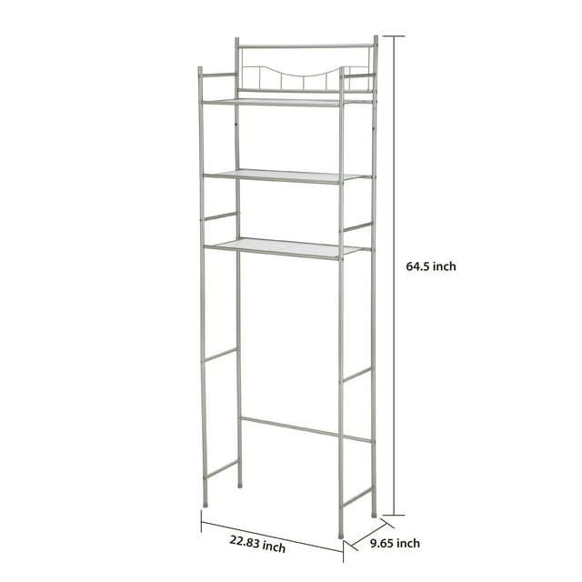 Product details Dimensions: 22.83"L x 9.65"W x 64.5"H Bathroom space saver with 3 shelves Fits over most standard toilets Holds up to 10 lbs. per shelf Ideal for adding additional storage and contemporary design to your bathroom Bottom shelf is 36.96" from the floor Stabilizer bar is 10.59" from the floor Distance between each shelf is 9" Satin Nickel finish Assembly required