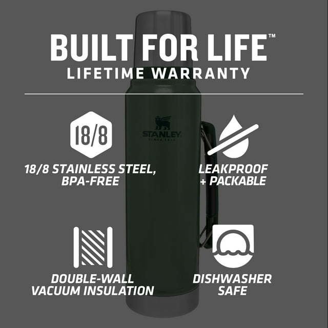 Get unbeatable value, legendary dependability, and the iconic looks of a Stanley Classic Stainless Steel Vacuum Insulated Thermos Bottle, 1.1 qt. For over a hundred years, Stanley bottles have been an indispensable traveling companion for hard-working men and women. The tried-and-true double vacuum insulation keeps your drinks either hot or cold for up to 28 hours. A large 35 oz (1.1 QT) capacity ensures it won’t run out of juice before you do. Made with durable and rust-proof 18/8 stainless steel that can handle the rigors of your toughest days. A simple yet jam-proof stopper pours smoothly & prevents leaks. Topped with a lid that doubles as a convenient drinking cup. A powder-coated hammertone green finish adds durability, better grip, and our signature look. Backed by a lifetime warranty, the Stanley Classic 1.1 QT Vacuum Insulated Bottle is built for your life.