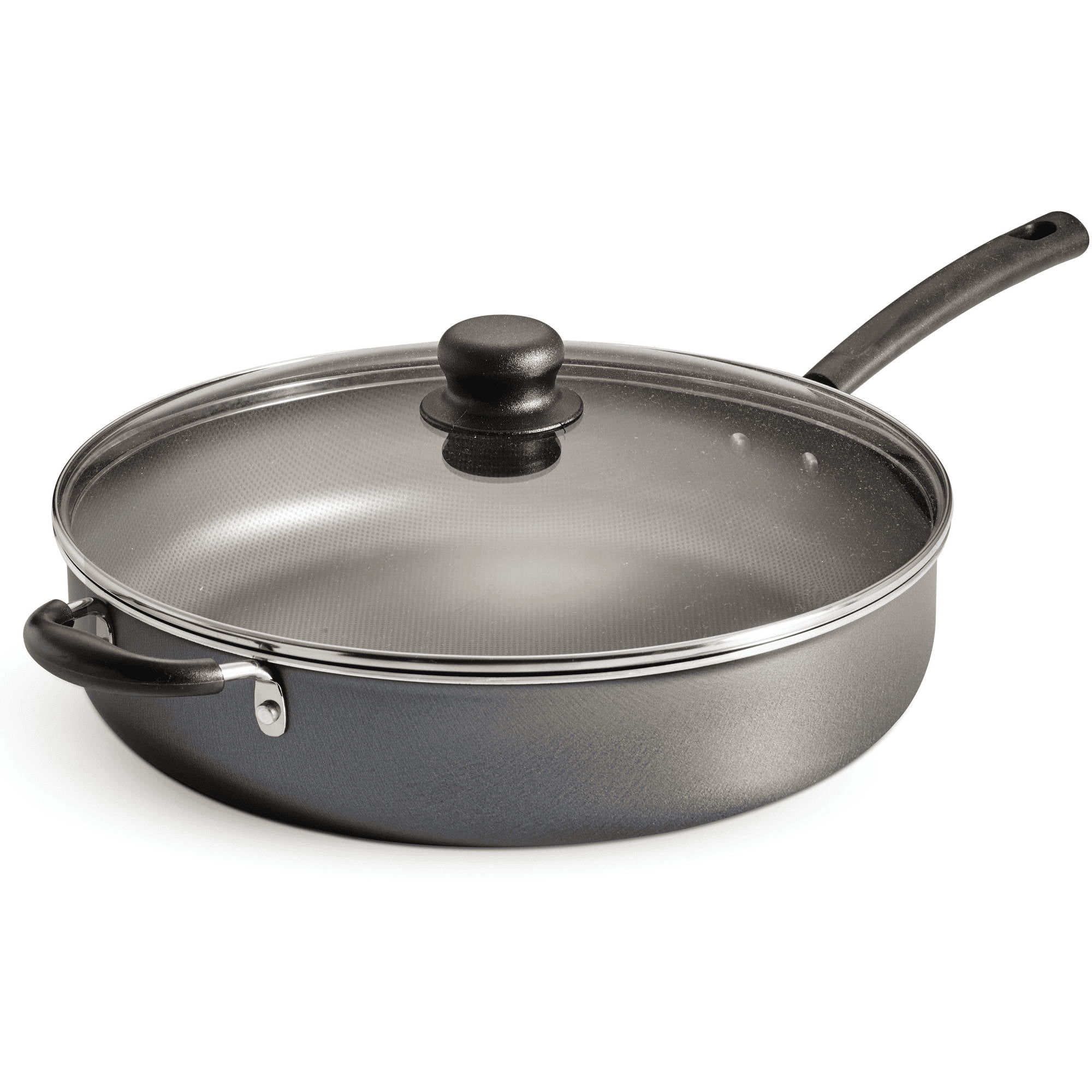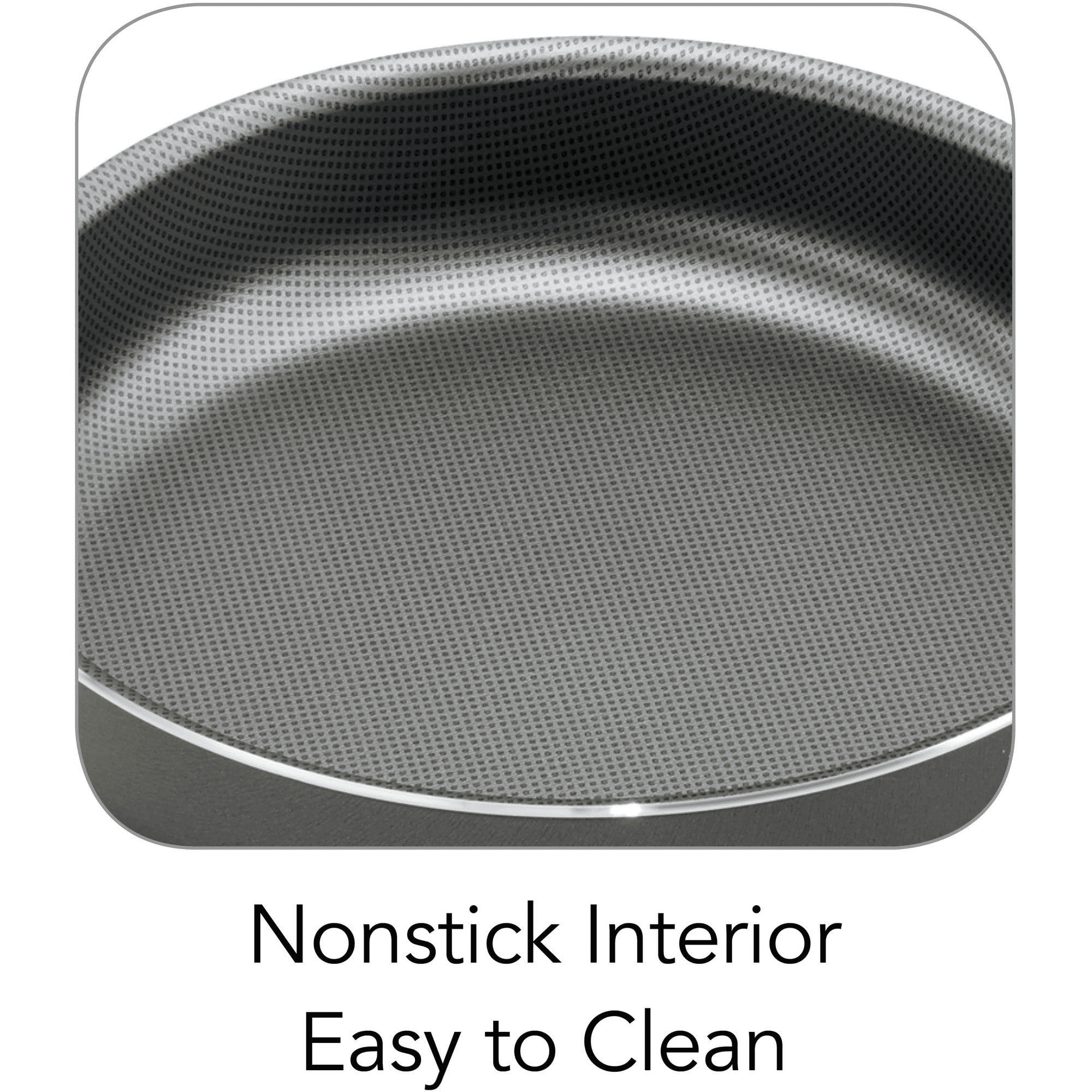 Generous capacity and cooking surface for preparing 1-pot meals and frying foods; Patterned gray interior nonstick coating for easy cooking and cleanup; Riveted, stay-cool handles; Heat- and shatter-resistant tempered glass lid allows easy monitoring of cooking progress; Compatible with electric, gas and ceramic glass cooktops; Dishwasher-safe; Model# 80119/557DS