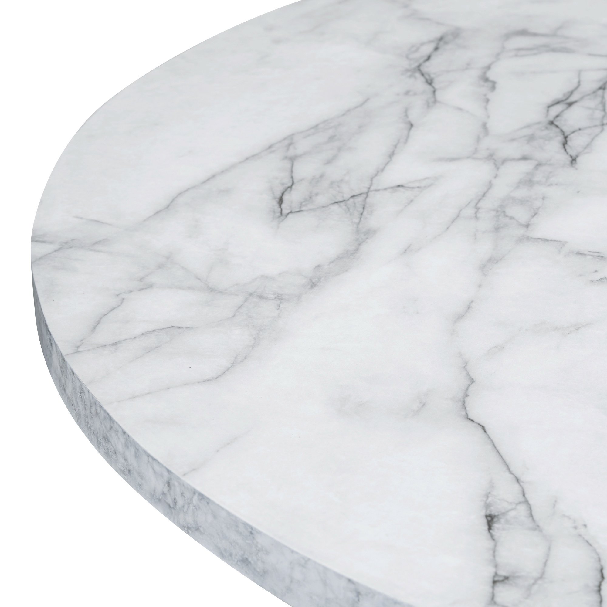 A 47.2-inch round white marble sticker tabletop is supported on the rock-solid cross bracket base to ensure stability. The richly textured marble table top is naturally combined with the rubber wood plywood. The rustic look leaves a lasting impression. The round shape encourages seamless conversation and a welcoming atmosphere. The perfect blend of timeless elegance and effortless charm, the dining table adds a touch of rustic beauty to your dining space.