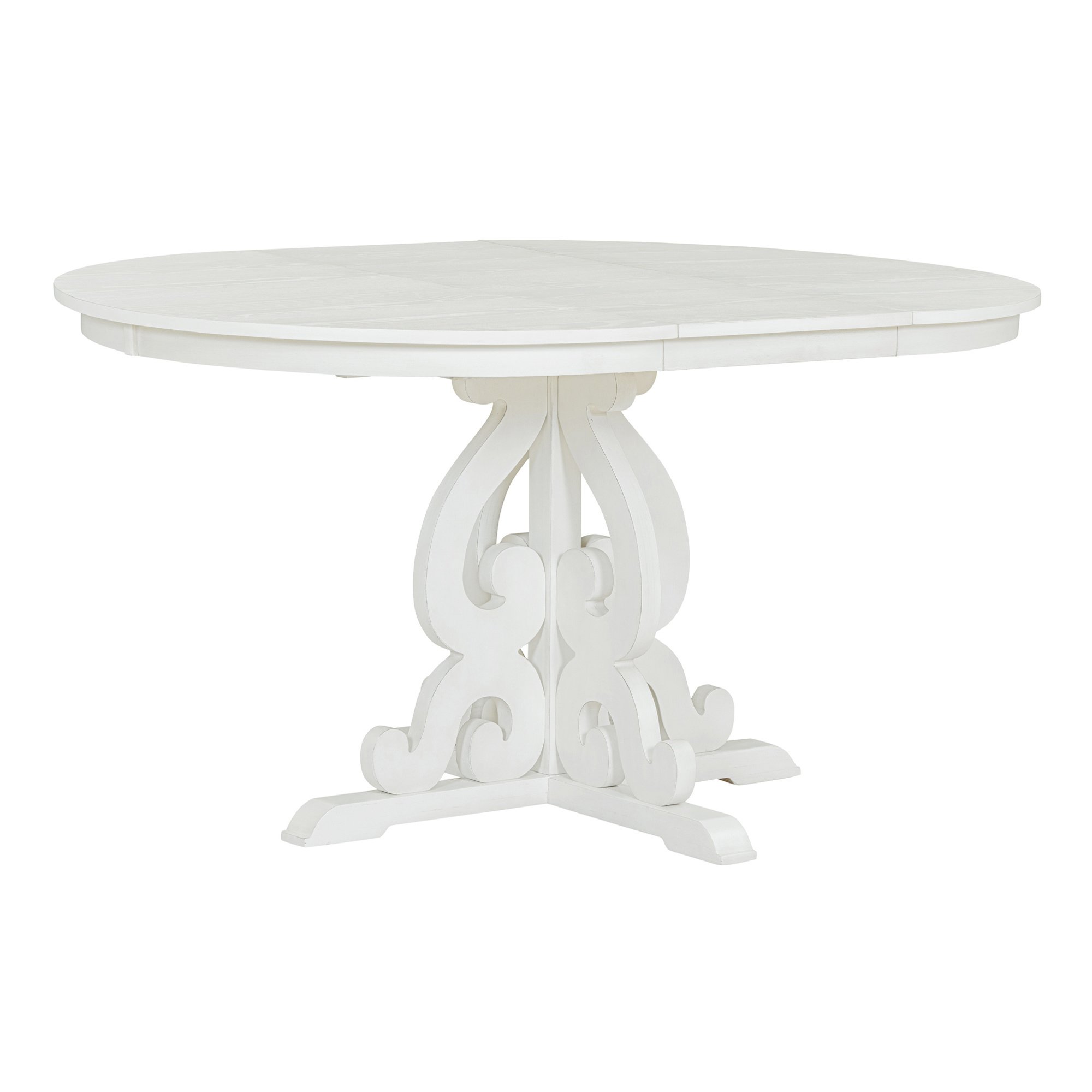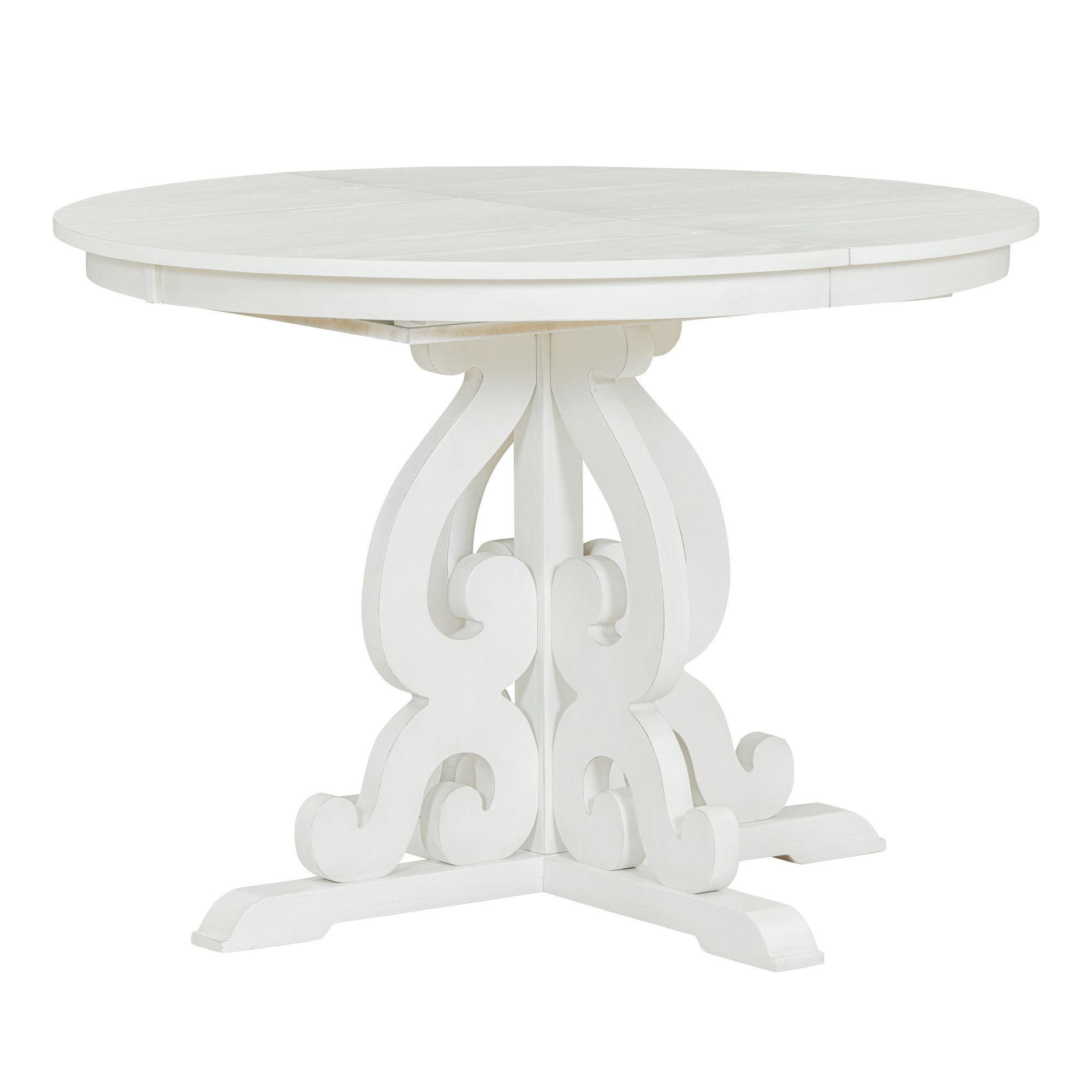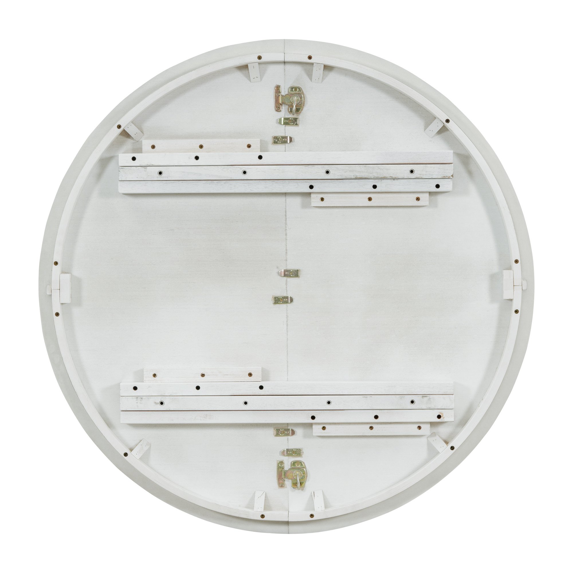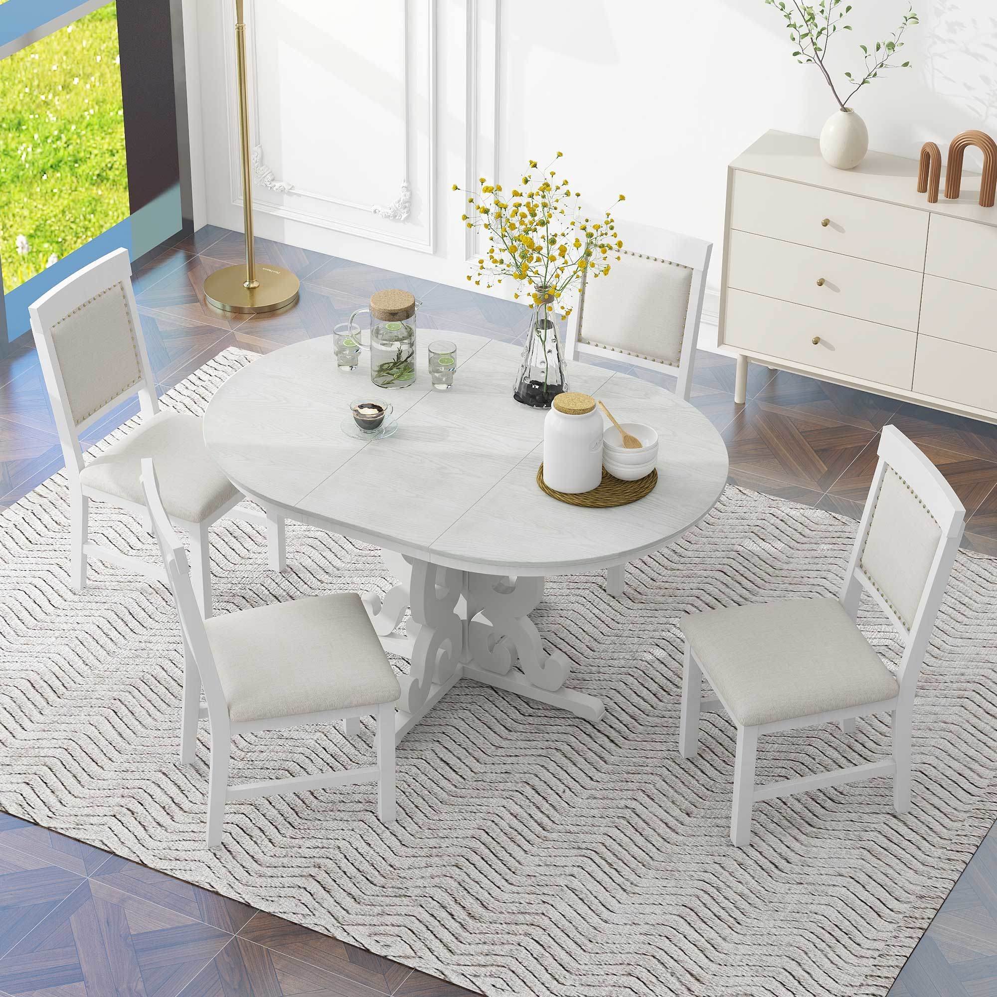 Retro StyleThe retro functional dining set comprises one extendable dining table and four matching upholstered chairs, blending understated elegance with a rich vintage feel. The table legs and backrests of the chairs feature symmetrical hollowed-out carving patterns. It's available in two colors, antique white and walnut. No matter which color dining set you choose, it will be the crowning touch of your restaurant, kitchen or dining room.Adjustable Dining Table TopThe round dining table features a 16-inch removable middle leaf to create an oval dining table of varying lengths for seating up to 6 people. The total length of the dining table is 58 inches, with the middle leaf removed the length becomes 42 inches. You can insert or remove the leaf as needed, switching the table back and forth between round and oval. I believe the adjustable design will bring convenience to your life to a great extent.